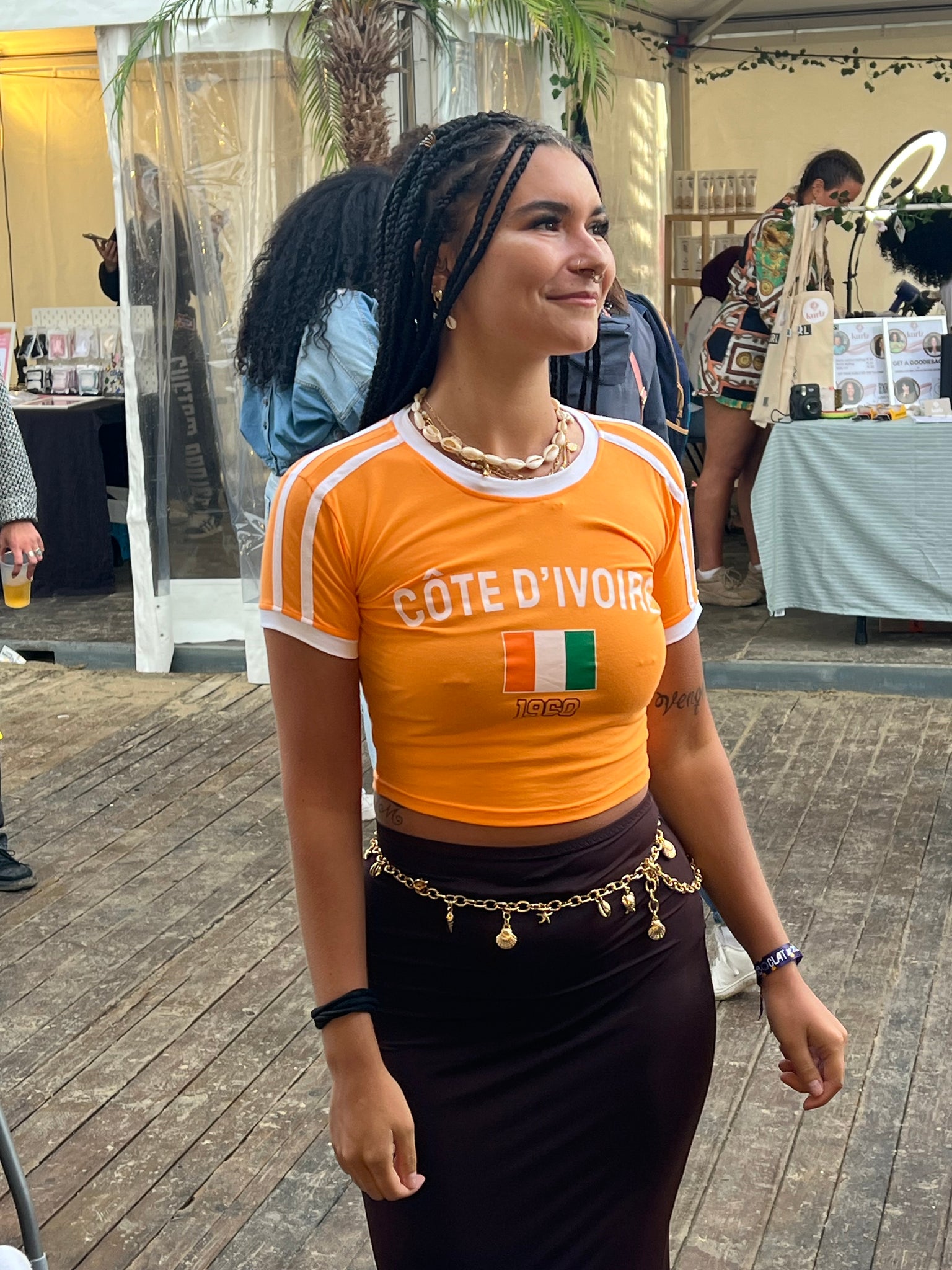 A fitted orange crop top with white trimmings around the neckline and sleeves, echoing the colors of the Ivorian Flag.